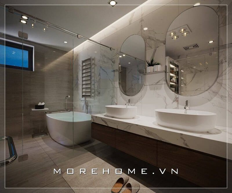 Trang trí phòng tắm chung cư với thiết bị vệ sinh hiện đại cùng gương trang trí,đá ốp tường, vách tắm kính