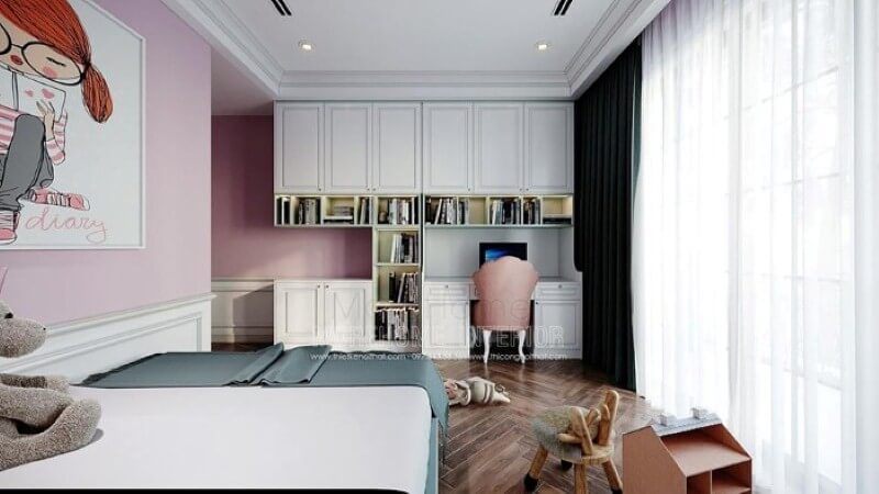 Góc học tập trong phòng ngủ con đẹp ấn tượng với bàn, kệ trang trí nhiều ngăn.