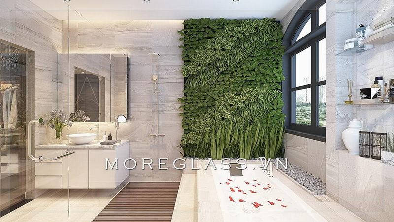 Mẫu thiết kế phóng tắm cao cấp cho nhà biệt thự, có bồn tắm nằm thư giãn và phòng tắm kính kết hợp bức tườn cây xanh mang đến không gian thư giãn tuyệt vời