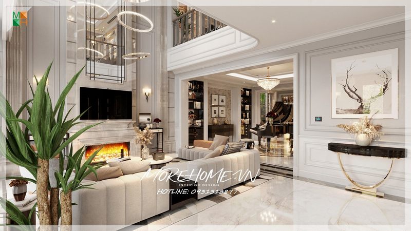 Trang trí nội thất phòng khách thông tầng biệt thự tân cổ điển cao cấp tại Vinhomes Imperia Hải Phòng.