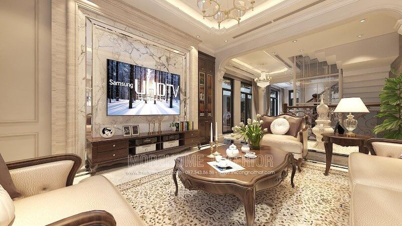 Một gợi ý tuyệt vời cho căn phòng khách chung cư tân cổ điển của bạn với mẫu kệ tivi gỗ tự nhiên sang trọng, đường nét tinh tế, ấn tượng