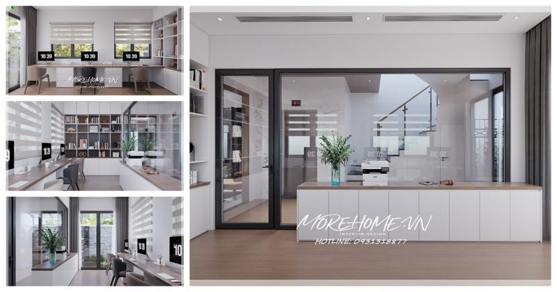 Thiết kế khu vực làm việc hiện đại, thông minh, kệ sách hiện đại nối liền với bàn gỗ công nghiệp giúp cho gia chủ tiện nghi, tập trung nhất