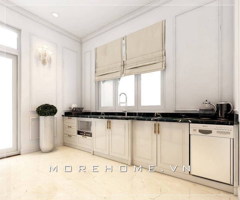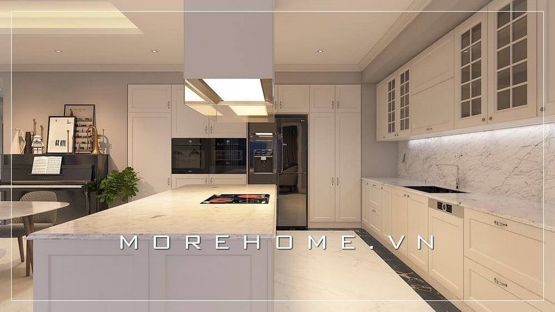Thiết kế phòng bếp chung cư tân cổ điển sang trọng, thiết bị phòng bếp hiện đại tạo không gian nấu nướng tiện nghi cho người nội trợ