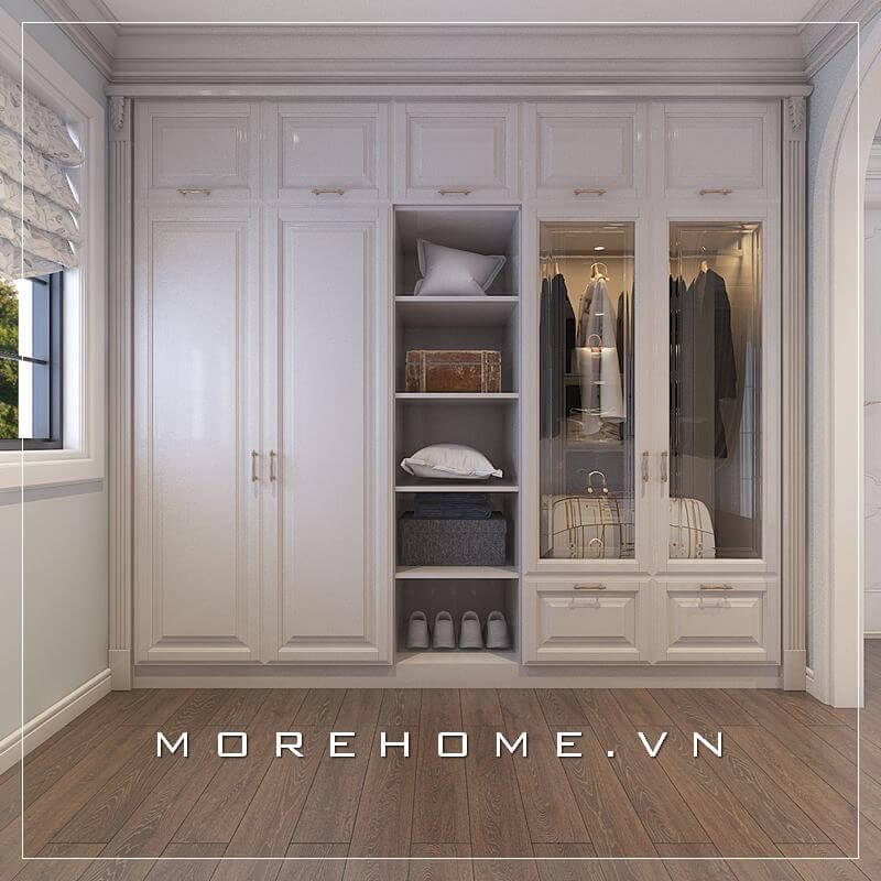 Thiết kế tủ quần áo gỗ ấn tượng với gam màu trắng chủ đạo mang đến cho gia chủ một không gian sang trọng, tinh tế