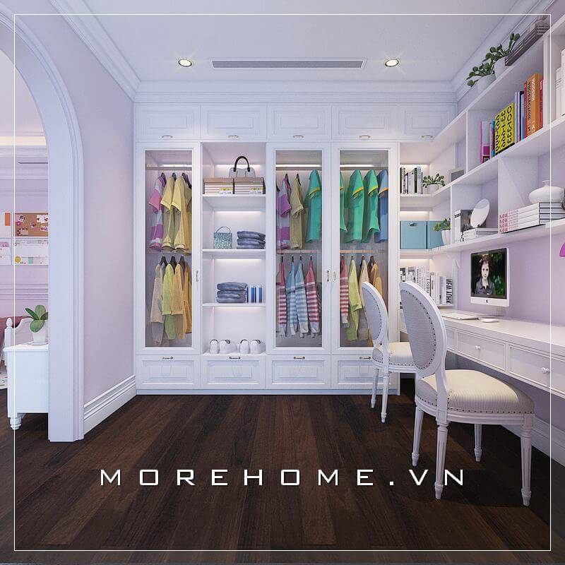 Tủ quần áo gỗ công nghiệp âm tường, tone màu trắng nhã nhặn kết hợp màu hồng nhẹ nhàng mang đến không gian phòng ngủ con thêm đẹp mắt, dễ thương hơn