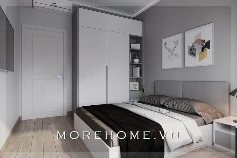 Mẫu tủ quần áo gỗ công nghiệp màu trắng kết hợp kệ trang trí ấn tượng cho không gian phòng ngủ