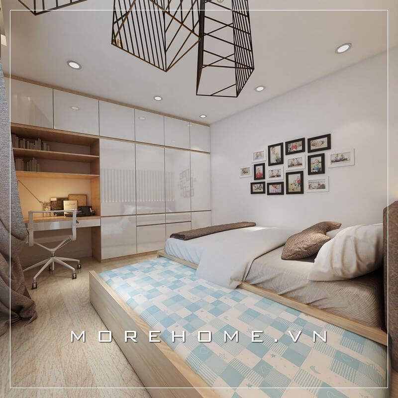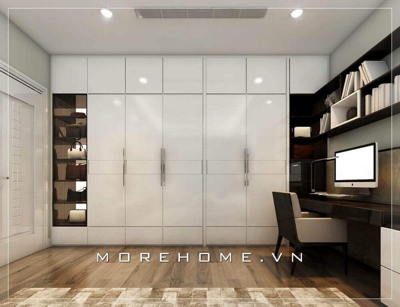 Tủ quần áo cánh mở hiện đại tích hợp với bàn học, sử dụng màu sơn trắng phối với màu nâu gỗ công nghiệp Acrylic tạo nên vẻ đẹp ấm áp cho căn phòng