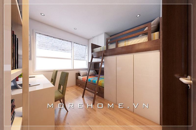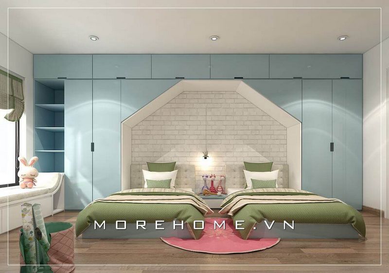 Tủ quần áo trẻ em hiện đại được thiết kế khá ấn tượng, kết hợp với giường tầng đa năng mang lại cho các bé một không gian nghỉ ngơi rộng thoáng và ngăn nắp hơn
