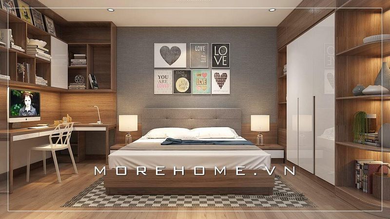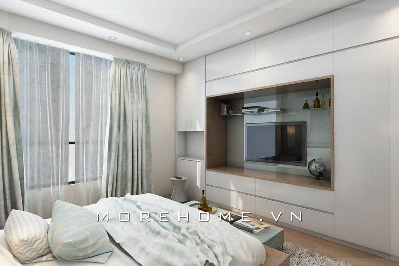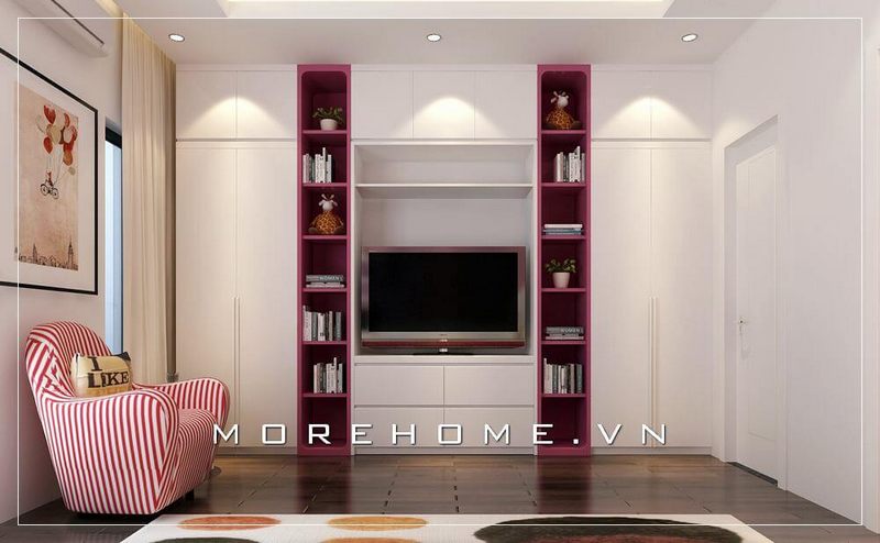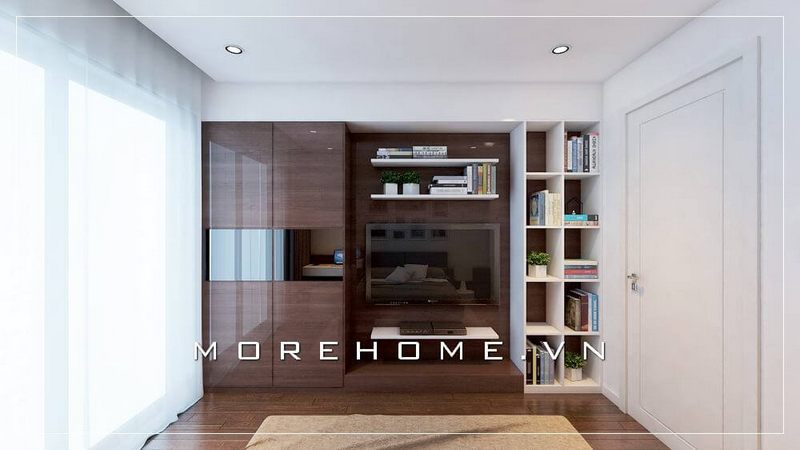 Sự kết hợp hài hòa giữa tủ quần áo và kệ ti vi đa năng mang đến cho căn phòng chật chội trở nên thoáng đãng hơn cả