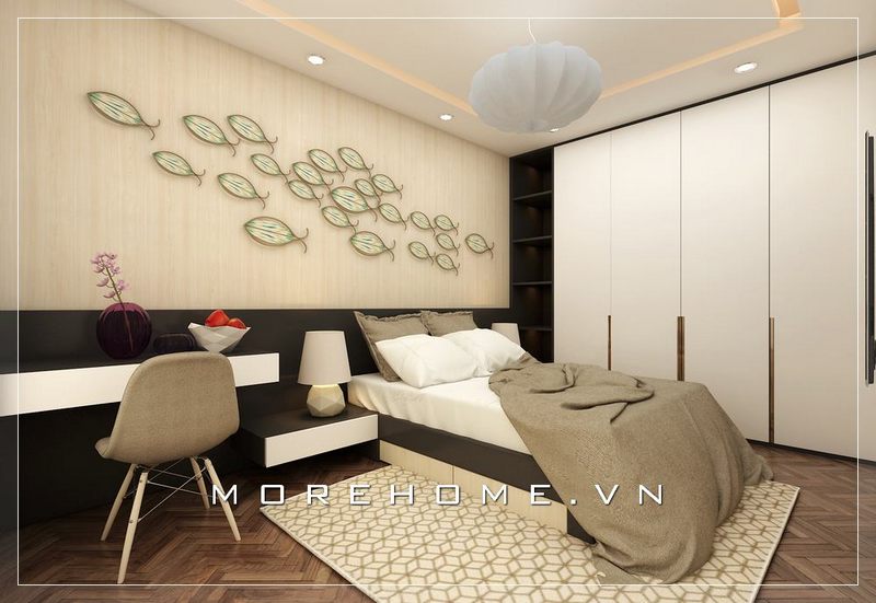 Một sự tích hợp hoàn hảo giữa tủ quần áo và kệ trang trí mang đến cho phòng ngủ thêm sinh động và ấn tượng