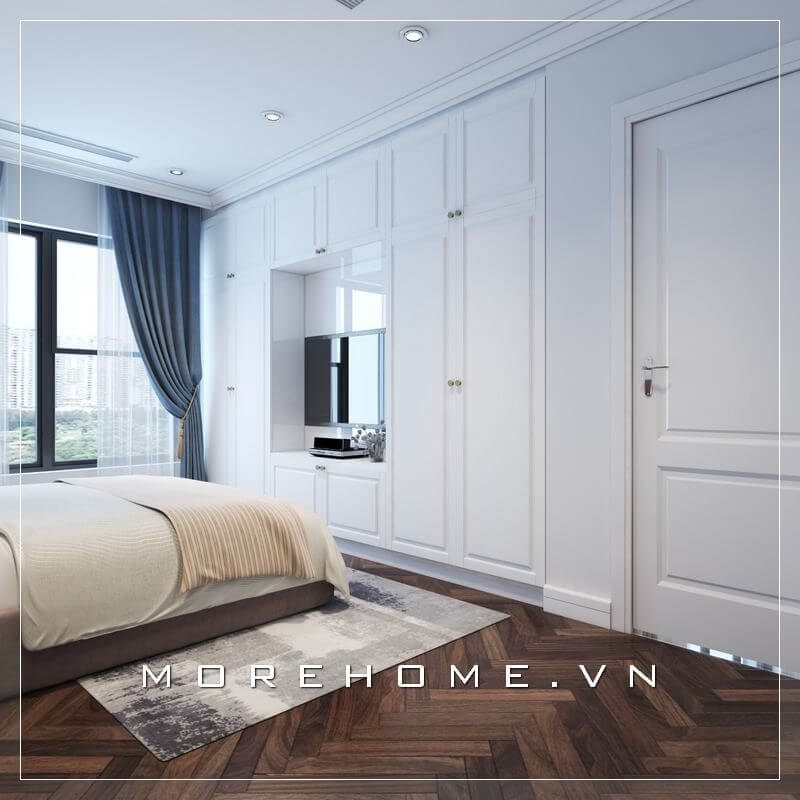 Tủ quần áo gỗ công nghiệp hiện đại màu trắng với lối thiết kế âm tường kịch trần, tích hợp kệ ti vi, kệ sách tiện dụng