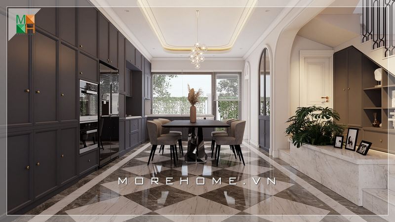 Thiết kế kệ tủ bếp chữ I kiểu dáng tân cổ điển đơn giản tông màu ghi xám sang trọng cho nhà phố, chung cư, biệt thự, phù hợp cả phong cách tân cổ điển và hiện đại