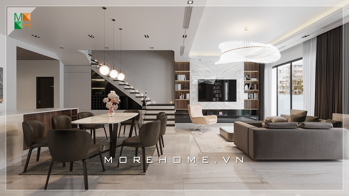 Thiết kế phòng khách liền phòng bếp, phòng ăn phong cách hiện đại đã trở thành xu hướng ấn tượng nhất hiện nay.